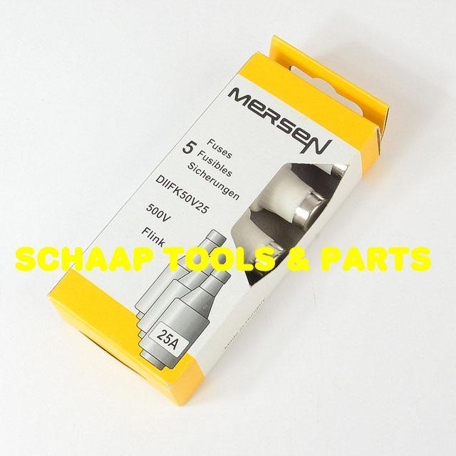 - Met genormaliseerde kleur GEEL is 25 ampère voor de smeltveiligheidswaarde in het kleine rondje in van de zekering.